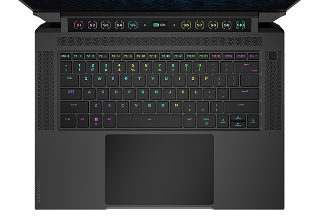 Voyager ima 10 lako dostupnih S dugmića za prečice koji se mogu personalizovati. Te S dugmiće pokreće Elgato Stream Deck softver, i zamišljeni su da budu najpraktičniji za strimovanje uživo ili Zoom pozive. Ovi dugmići bi trebalo da budu dostupni i kada je laptop zatvoren, čime se korisniku omogućava da proveri nivo baterije pre paljenje uređaja. Laptop takođe ima tastaturu u punoj veličini sa pozadinskim RGB osvetljenjem, kao i FHD web kameru od 1080p i vrlo veliki trackpad.