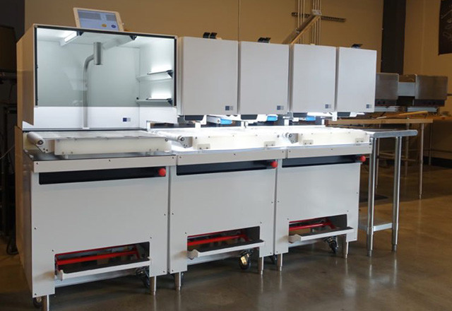 Radnik sa iPad uređajem govori robotu koju vrstu pice da napravi i potom stavlja smrznuto testo na pokretnu traku.