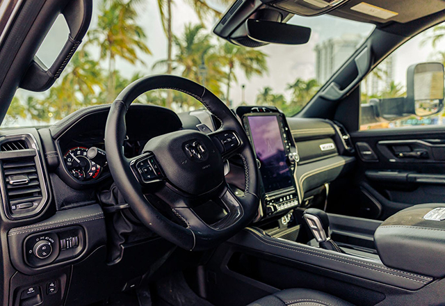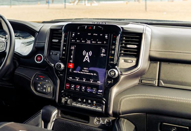 Kabina ovog kamioneta nudi kombinaciju sportskih elemenata, luksuznih materijala i visokotehnoloških funkcija poput ogromnog vertikalno postavljenog infotejnment ekrana.