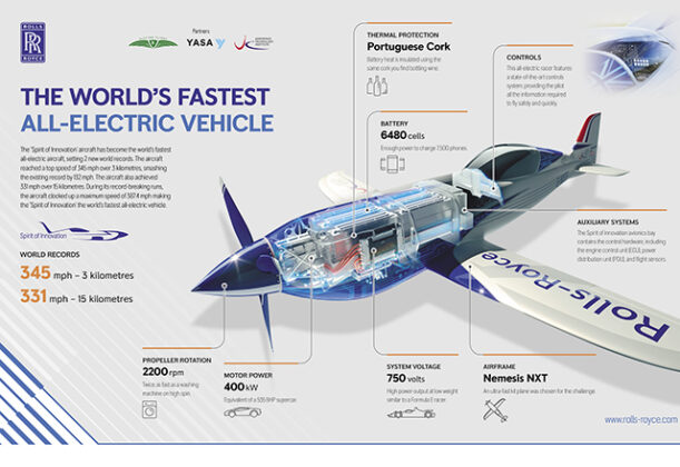 Samo dva meseca nakon svog prvog leta, avion koji su u kompaniji Rolls-Royce nazvali „Duh inovacije“ postigao je maksimalnu brzinu od 624 km/h, postavivši novi brrzinski rekord za električne avione. Takođe je postigao brzinu od 555 km/h tokom deonice od 3 kilometra i najkraće vreme za postizanje visine od 3.000 metara (202 sekunde). Rekordi još uvek čekaju da budu zvanično potvrđeni, ali ako brzina od 555 km/h bude potvrđena, to će potući dosadašnji rekord od 342 km/h – koji drži a Siemens Extra 330LE – za impresivnih 212,4 km/h.