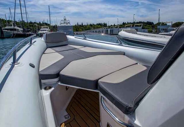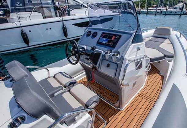 On ima pregršt standardne opreme. Tubusi su Orca Hypalon, tapacirung je premijum kvaliteta i dolazi od brenda Silvertex a tu je i mekani pod od sintetičke SeaDek tikovine. Silvertex i SeaDek se uglavnom u industriji nude kao dodatne opcije. Vodeći se time da niko ne treba da isplovljava na more bez plotera i radija, Golden Line 750 ima Garmin multifunkcionalni displej od 12 inča i VHF.