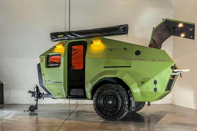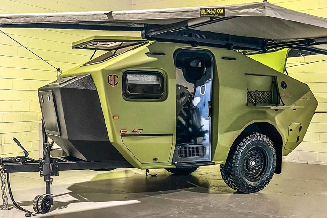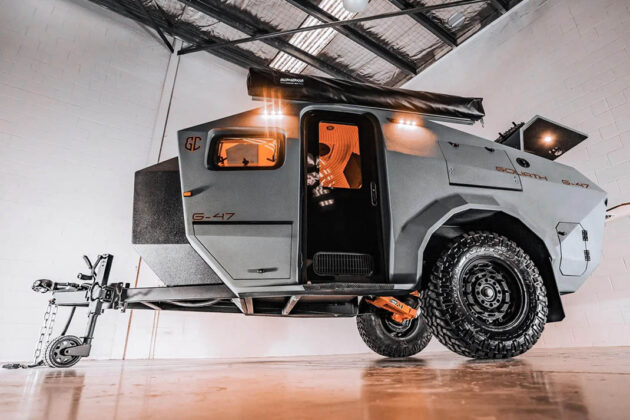 G-47 terenski kamper (4,7m) je još jedan u dugačkom nizu poslepandemijskih plovila za bekstvo, kamperov oblik čekićaste glave nije samo za pokazivanje. Sistem nezavisnog vešanja sa dva Cruisemaster amortizera ublažava zubate gume za blato veličine 35 inča, koje su pričvršćene za 18-inčne terenske točkove, dok obezbeđuje vrlo prohodan klirens do 60 cm.