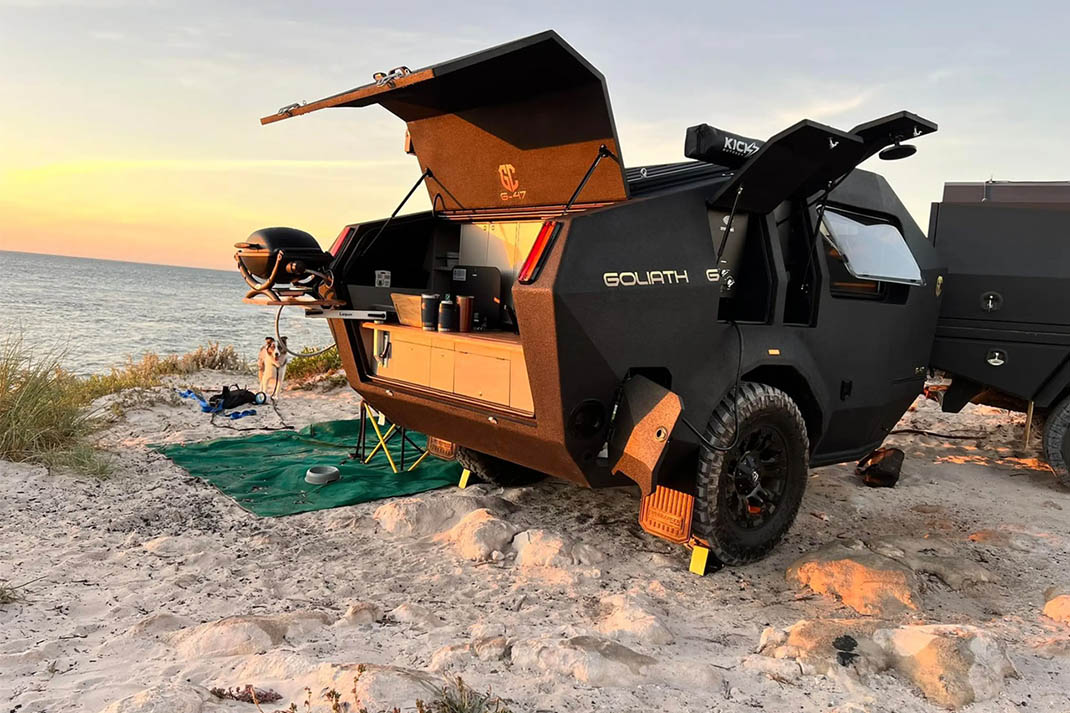 Goliath G-47 je vučna kontradikcija koja spaja jednu od najotpornijih spoljašnosti sa udobnim životnim konceptom, potpuno opremljenim funkcijama kao što su sklopivi tuš sa efektom kiše, električni kit za rad van mreže i roštilj na izvlačenje. Prikačite ga za Land Cruiser ili Patrol, i voziće po stazama i potocima kako bi sa sobom doveo kućnu atmosferu.