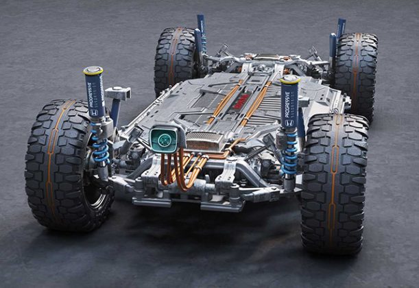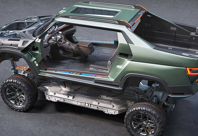 Koncept Ridgeline EV je postavljen na platformu koja liči na električni skejtbord, sa elektromotorima napred i nazad i velikom baterijom u sredini.