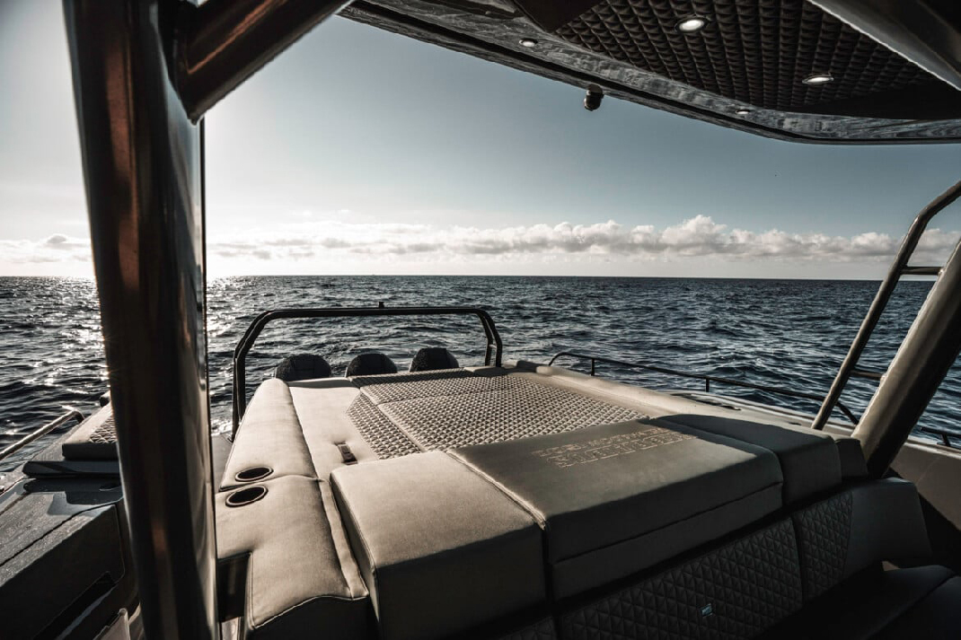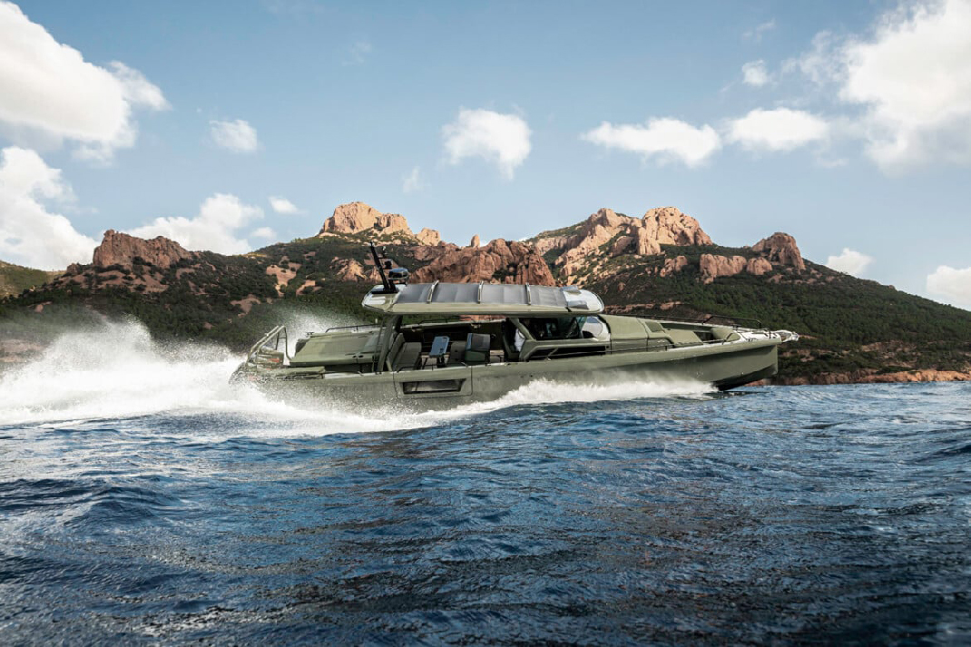 Primerak prikazan u Kanu obojen je u upečatljivu nijansu Stealth Green, zbog koje se ističe među pretežno belim jahtama u marini. Enterijer prati istu notu, sa prošivenim kožnim sedištima u odgovarajućem tonu. Kupci, naravno, mogu da biraju i druge boje, poput Black Ops, Stealth Deep Blue ili Stealth Phantom Grey.