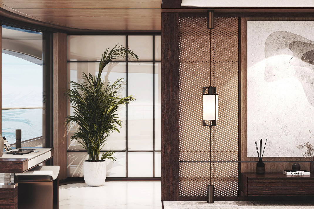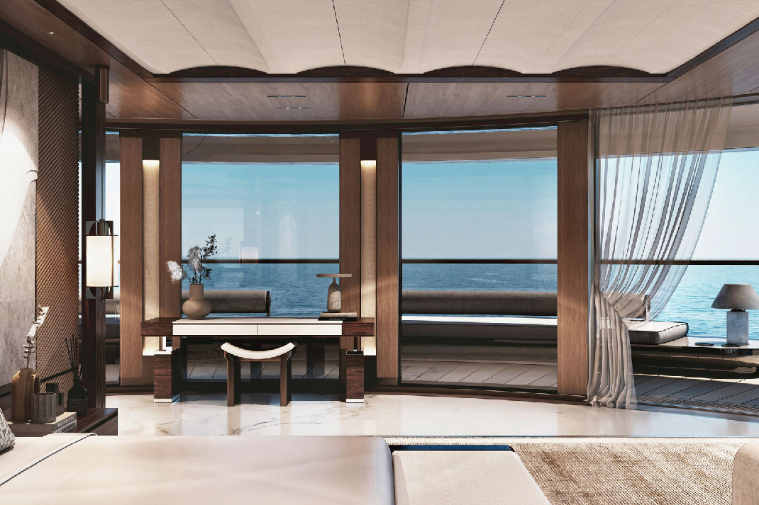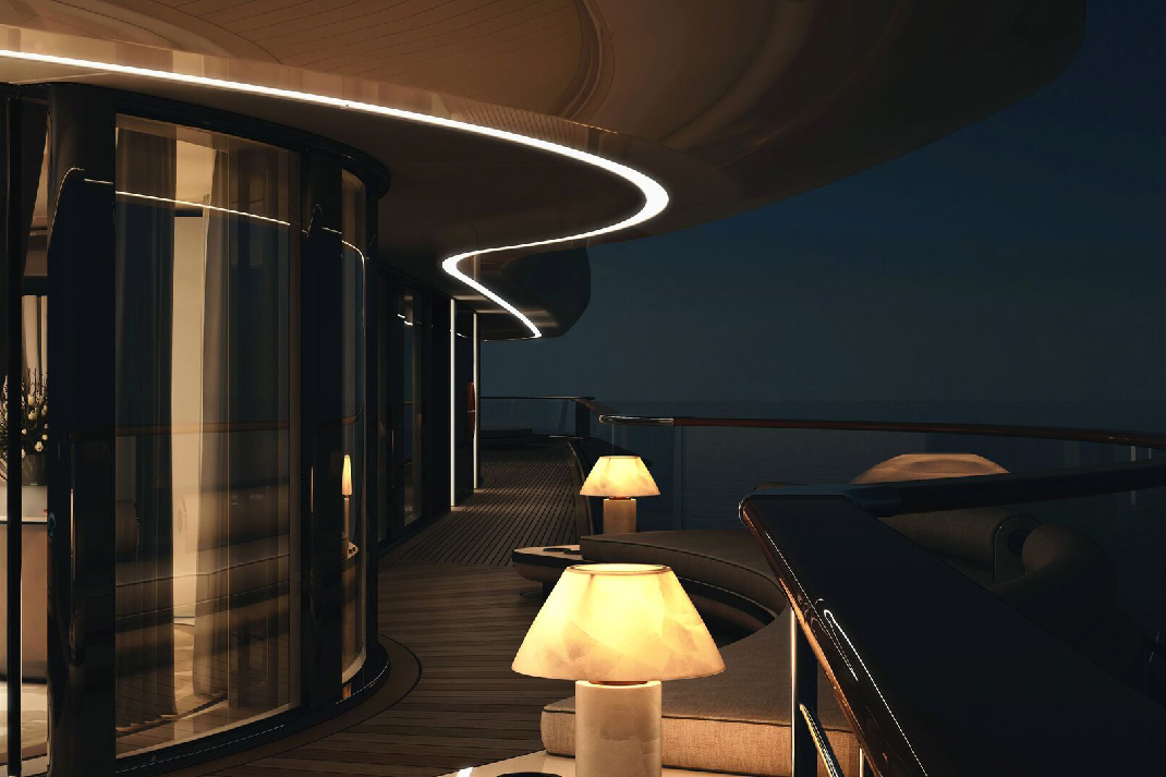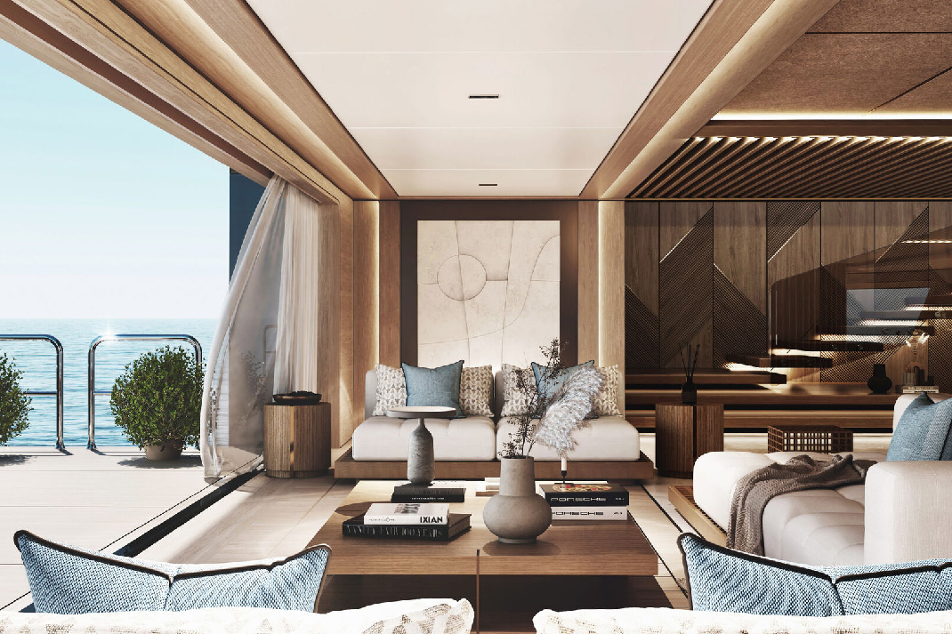 Iako duga više od 100 metara, jahta ima samo 10 gostinskih kabina, jer je naglasak stavljen na prostor za zabavu i opuštanje. Na glavnoj palubi nalazi se veliki salon, dok je donja paluba rezervisana za beach club sa staklenim zidovima punog profila. To je rešenje koje omogućava uživanje tokom cele godine, bez oslanjanja na sklopive terase.