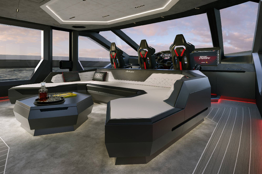 Kokpit donosi tipičnu Lamborghini ergonomiju. Sadrži trostruka pilotska sedišta sa grbom marke, heksagonalne motive i prepoznatljive Y-linije iz kabina supersportskih modela. Direktor dizajna, Mitja Borkert, opisuje jahtu kao „oblik adrenalina“.