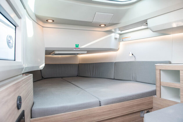 Elegantne proporcije modela Saxdor 270 skrivaju kabinu za spavanje sa bračnim krevetom i toaletom sa lavaboom, čime se model 270 GTO unapređuje iz glisera za dnevne plovidbe u stilizovani vikend brod. Unutra imamo mnogo prirodnog svetla koje dolazi kroz prozor na plafonu i otvore, što ceo prostor čini većim.