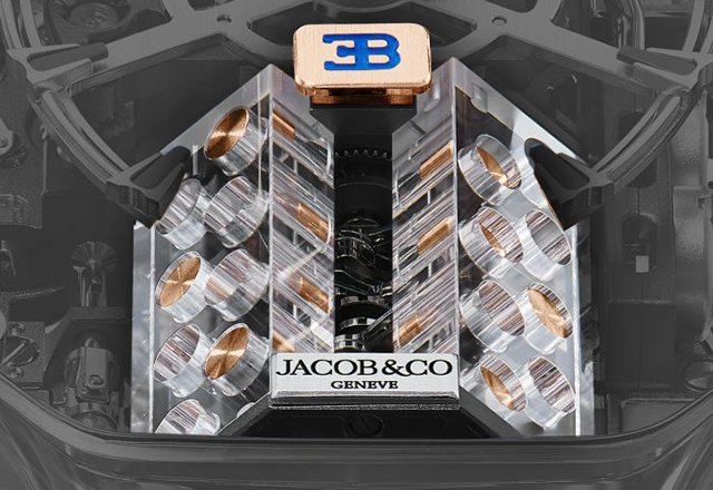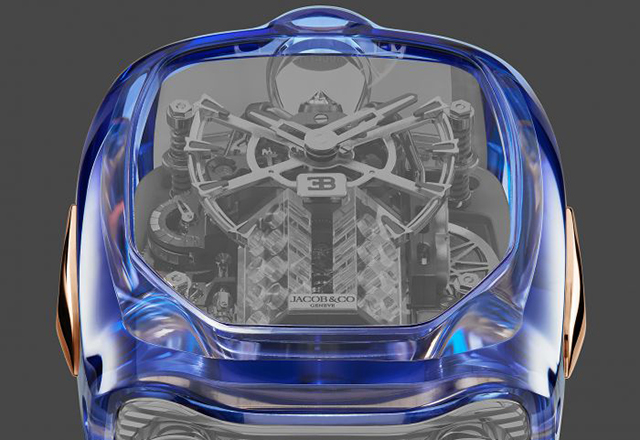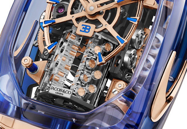 Čitavo kućište sata Bugatti Chiron Blue Sapphire Crystal napravljeno je od safirnog stakla dok je titanijum korišćen za krunicu i dva dugmeta sa donje strane sata. Unutra se nalazi JCAM37 mehanizam na ručno navijanje sa 51 dragim kamenom, kompanije Jacob & Co., i ukupno 578 ručno sklapanih komponenti. Animirani Bugatti W16 motor mahnito pumpa a dva turbopunjača (ne četiri, kao u pravom Chironu) vrte se istovremeno.