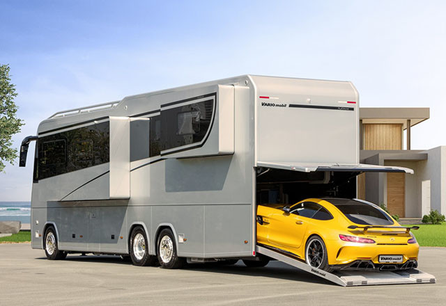 Ovaj kamper ima moderan enterijer koji podseća na luksuzno opremljeni hotelski apartman, kao i poseban prostor za parkiranje raznih egzotičnih automobila kao što su Mercedes-AMG GT ili Porsche 911.