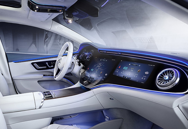 Mercedes-Benz je prvi put predstavio MBUX Hyperscreen na CES 2022. Ovaj hiperekran sastoji se od tri ekrana: LCD ekran, ICD (Ekran instrument table) i dva OLED ekrana – CID (Centralni, informacioni ekran) i CDD (suvozačev ekran). Ekrani se nalaze ispod staklene ploče koja ih pokriva, tako da svi zajedno izgledaju kao jedan, celoviti displej. Upotreba napredne plastične OLED (P-OLED) displej tehnologije, omogućava sistemu za informisanje i zabavu u Mercedes-Benz EQS EV da prikazuje jasnu, izoštrenu sliku i tekst.