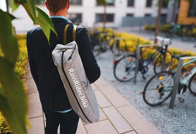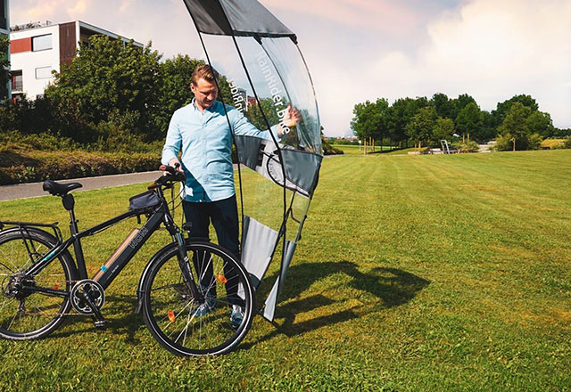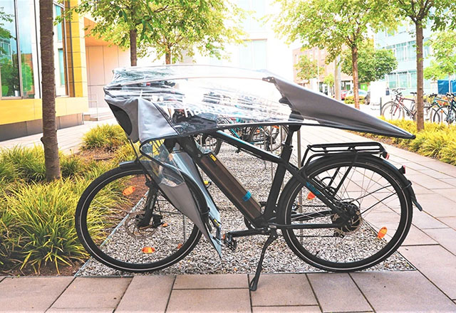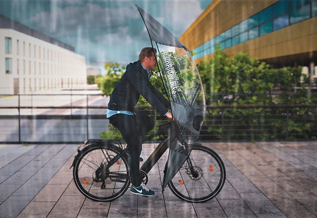 Kišobran od mekog materijala kompanije RainRider osmišljen je da se zakači na upravljač e-bicikla kako bi zaštitio biciklistu i bicikl od kišovitih vremenskih uslova i smanjio emisiju ugljen-dioksida tako što će omogućiti biciklistima da voze i po kiši.