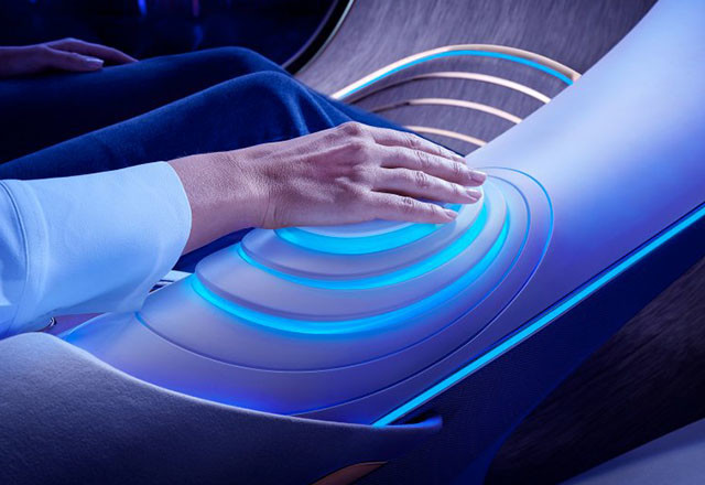 Za početak, nema volana. S obzirom na to da je ovaj futuristički automobil očigledno (u teoriji) autonoman, nema ni potrebe za volanom. Umesto toga, putnici komuniciraju sa automobilom preko ovalnog upravljača koji se razvlači kao harmonika iz centralne konzole do vaše ruke. Tog trenutka kada stavite ruku na upravljač, on (i sedišta) mogu da vibriraju u ritmu vašeg disanja i pulsa.