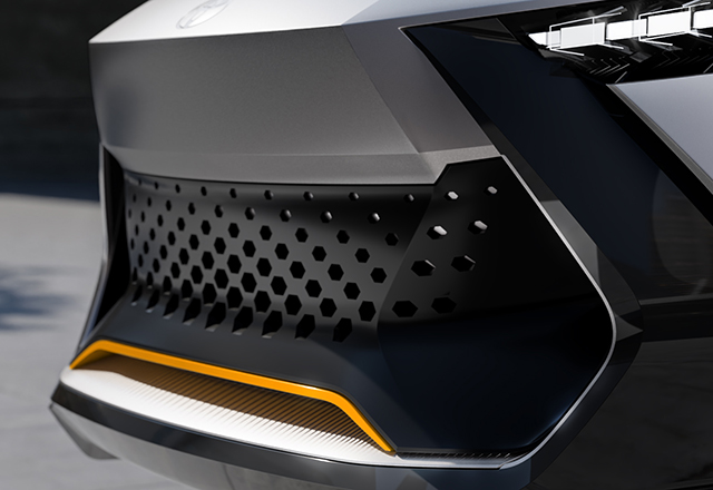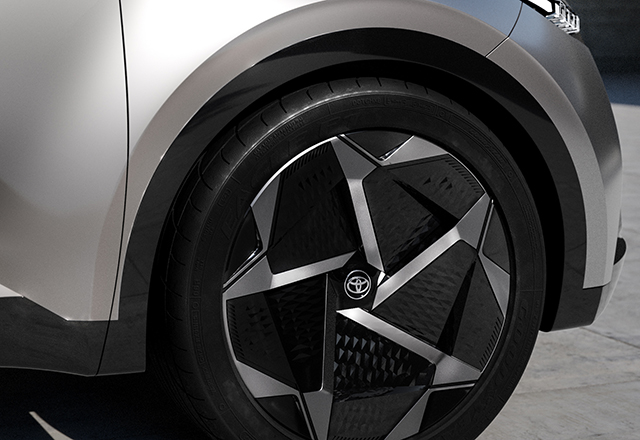 HAMMERHEAD izgled prednjeg dela je rezultat 3D arhitekture postignute isprepletenim oblicima i smelim svetlosnim potpisom. Otvori prednje rešetke se smanjuju u veličini, dok su svetla uža kako bi naglasila prisustvo visoke tehnologije. Izgled prednje maske Toyote C-HR prepoznaje se po oštrom i prodornom dizajnu nalik ajkuli, ujedno nagoveštavajući spremnost da jurne napred. Toyota C-HR Prologue stiže i s trećom bojom – to je detalj s nijansom sumpora uz osnovne metalik srebrne i reciklirane crne boje.