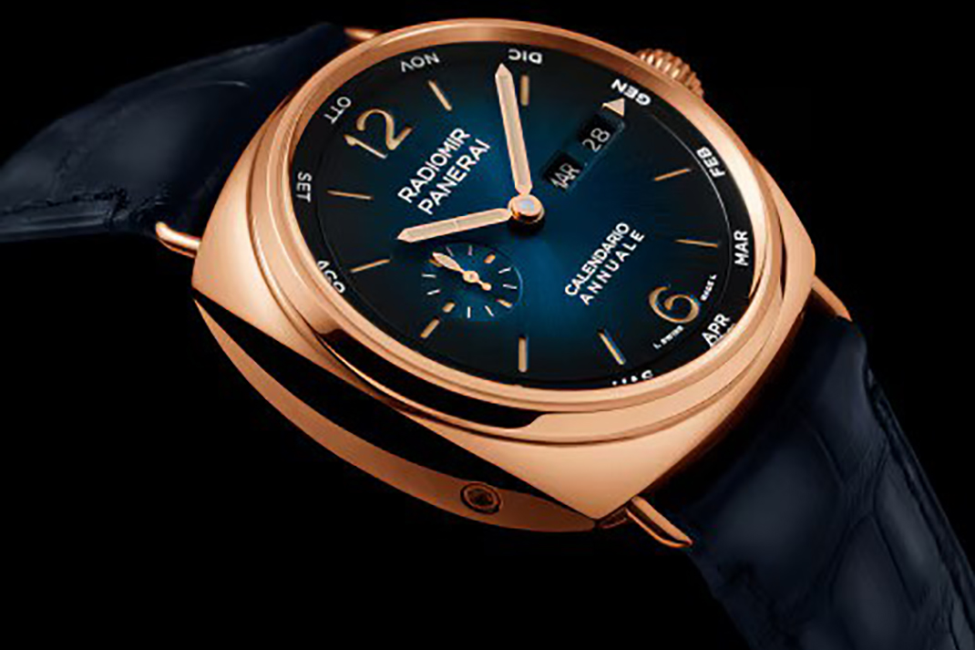 Godišnji kalendari su interesantni jer idu skoro do stalnog kalendara, ali ne uključuju ispravku za prestupne godine. To znači da morate da prilagođavate godišnje kalendare do jednom godišnje, u februaru. Većina godišnjih kalendarskih satova košta manje od stalnih kalendara, a često imaju čistije brojeve. Na kraju, kućišta godišnjih kalendarskih satova obično imaju manje, ako ih uopšte ima, ubačenih ispravljača na kućištu. Ovaj Radiomir godišnji kalendar ima samo jedan ubačeni ispravljač na boku kućišta, koji se koristi za prilagođavanje meseca.