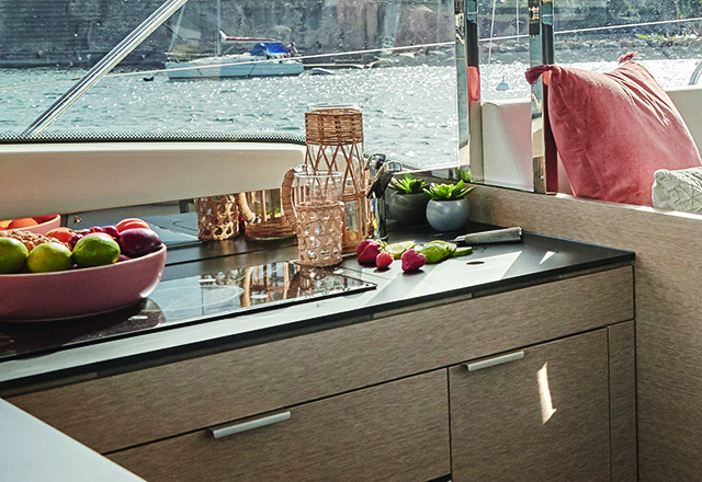 U kuhinju se ulazi sa krmene palube kroz četvorodelna klizna staklena vrata koje, kada se skroz otvore, kreiraju prolaz širine 1,26 m. Sa leve strane nalazi se radna površina u obliku slova „L“ sa skladišnim prostorom ispod. Ta površina služi kao šank za goste na krmenoj palubi.