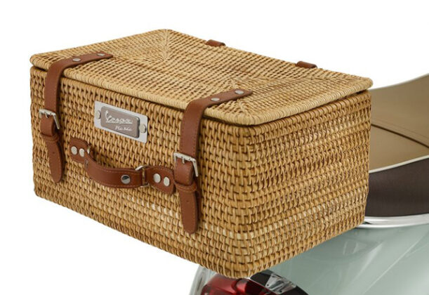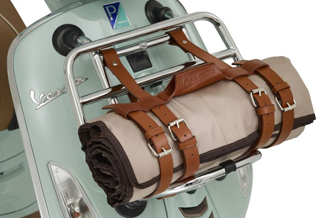Sa prednje strane primetićete još jedan hromirani nosač za stvari. Na njemu možete da ponesete ćebe, da fleke od trave ne bi uništile elegantnu italijansku odeću koju ste za piknik obukli vi i vaš partner. Ćebe ima prišiveni braon kožni kaiš koji ima dvostruku ulogu – on pričvršćuje ćebe za nosač i služi kao ručka kada nosite ćebe do lokacije gde će se održati ručak. Svakako vredi napomenuti da je i na ćebetu i na korpi ponosno istaknut Vespa Pic Nic logo.