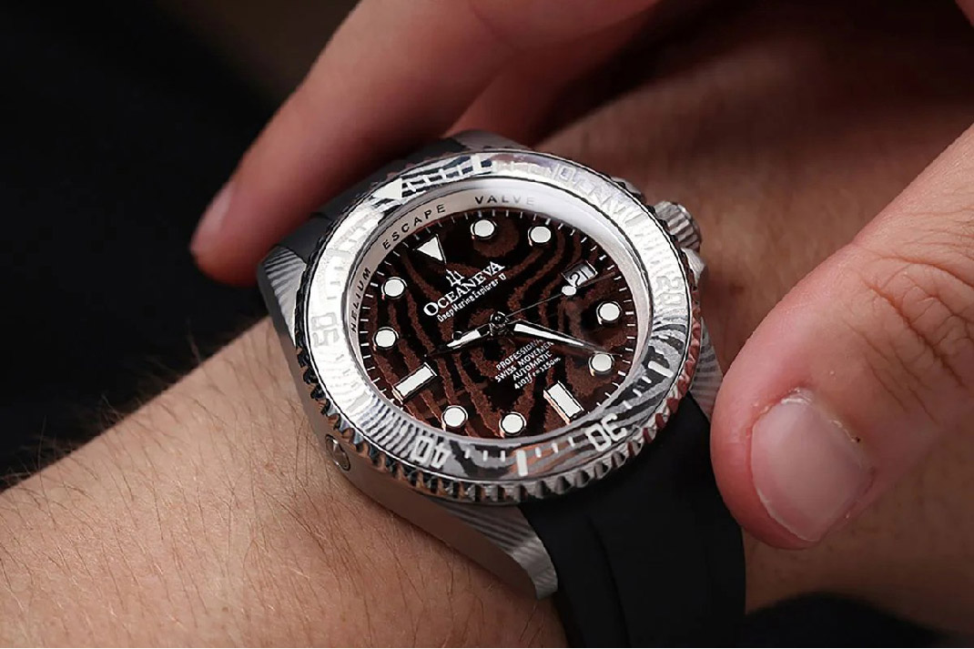 Isti damask uzorak nalazi se i na kopči, jednosmernom ronilačkom bezel prstenu, kao i na brojčaniku. Brojčanik je dodatno jonizovan kako bi dobio toplu kafeno-smeđu boju, što savršeno naglašava naizmenične polirane i matirane talase teksture. Svaki sat je jedinstven sa šarama, što je prirodna osobina damask čelika.