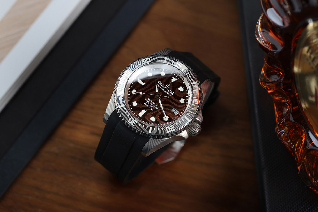 Isti damask uzorak nalazi se i na kopči, jednosmernom ronilačkom bezel prstenu, kao i na brojčaniku. Brojčanik je dodatno jonizovan kako bi dobio toplu kafeno-smeđu boju, što savršeno naglašava naizmenične polirane i matirane talase teksture. Svaki sat je jedinstven sa šarama, što je prirodna osobina damask čelika.