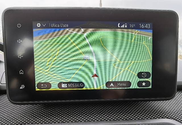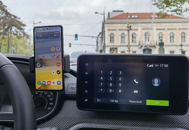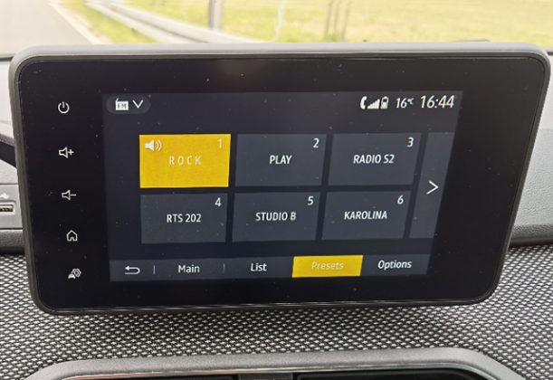 Ekran dijagonale osam inča ok reaguje na dodir prsta, a levo od ekrana su direktne prečice ka najvažnijim komadama, s malko tvrđim tasterima. Među tim tasterima su i komande za kontrolu zvuka. Suvozaču su predaleko za lako korišćenje. Levo od ekrana je držač za telefon. Njega smo koritili za drugi telefon. Prvi smo povezali s autom, a drugi je na dohvat ruke i lako se odgovara na pozive i uključuje spikerfon.
