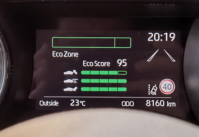 Pred vozačem su tri merenja vožnje: kako se startuje, sama vožnja, i kočenje. Tokom vožnje se na EcoZone prikazu vidi kako trenutno vozite, da li ste dali previše gasa, ili ste štedljivi i koji su sve motori uključeni. Sva tri segmenta se ocenjuju na skali od 1 do 5, i kad se zaustavite vidite koliko je vožnja bila ekonomična. Mi smo uspeli da dođemo do 95 bodova u tom EcoScore-u. Ovaj način je vrlo interesantan takmičarski nastrojenim vozačima (ceo muški rod?). Mi smo pokušavali da iz svake vožvnje izvučemo maksimum i da budemo bolji nego pre. Na velikom displeju postoji prikaz aktuelne situacije, da li se koristi baterija, ili benzin, da li se puni baterija dok kočite, ili prazni jer vozite lagano i smireno, pa je uključen elektro motor.