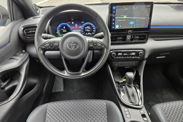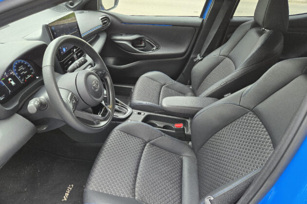 Postoje dva glavna utiska o enterijeru Yarisa, jedan dobar i jedan loš – kvalitet izrade i sumornost materijala. Sve deluje kao savršeno sklopljeno, bez ijednog zvuka kloparanja ili škripanja. Problem je što je tamno i tmurno, sa tamno sivim plastikama koje čine veći deo instrumentalne table. Iako postoje neki mekani materijali na dodir, iritantno je da su i vrh vrata i tanko tapacirani naslon za ruku čvrsti kao kamen, tako da zapravo nema udobnog mesta gde biste mogli da odmorite vaš lakat.