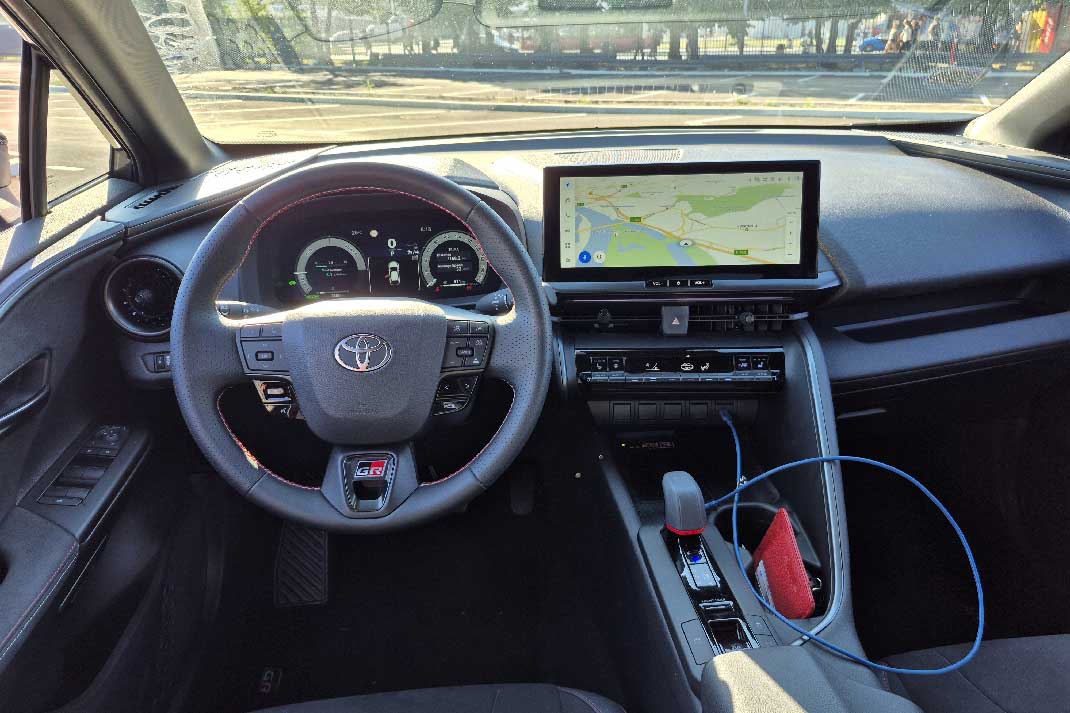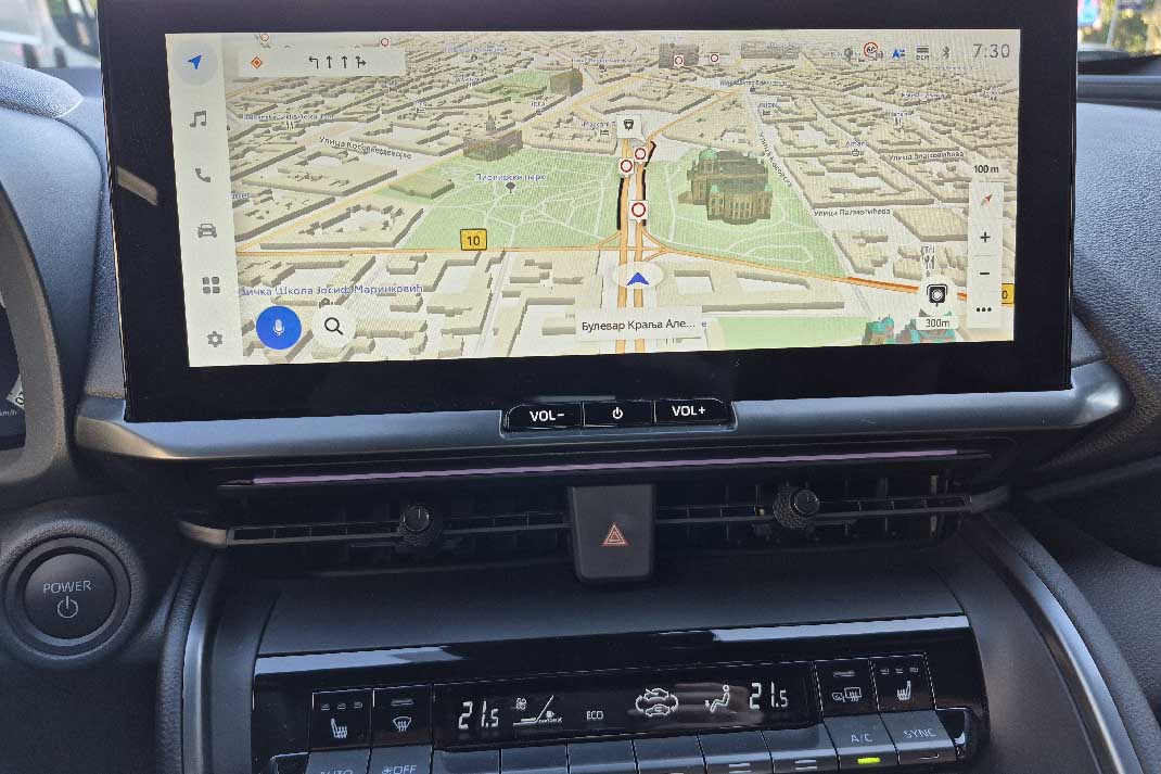 Raspored komandi i UX (user experience) su intuitivni: fizički tasteri za najčešće funkcije ostaju tu gde ih očekujete — klima, audio, grejanje sedišta — dok centralni 12,3-inčni ekran donosi moderan UI (user interface) sa jasnim ikonama, logičnim menijima i brzim odzivom na dodir. Toyota je očigledno slušala vozače: nema beskrajnog „kopanja“ kroz menije da biste uključili osnovne funkcije. Ekran je dovoljno veliki da ima mesta za osnovni meni u levom uglu, dok dalje u nastavku imate sve druge informacije. Primetili bi da malo podseća na komande u popularnim tabletima sličnih dijagonala. Jedino što je ekran širok i pljosnat pa su njegove proporcije 21:9. Najveći strah vozača kod ’pljosnatih’ ekrana je loš prikaz navigacije. Toyota je to rešila 3D perspektivom prikazom ulica, pa je daljina i dalje dobro vidljiva.
