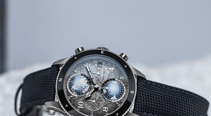 Montblanc-ov 42mm Geosphere 0 Oxygen The 8000 ($7,600) je upečatljivi dodatak liniji 1858 Geosphere, koju karakteriše inovativni prikaz svetskog vremena pomoću rotirajućih diskova koji predstavljaju severnu i južnu poluloptu kako bi pokazali vreme širom sveta.