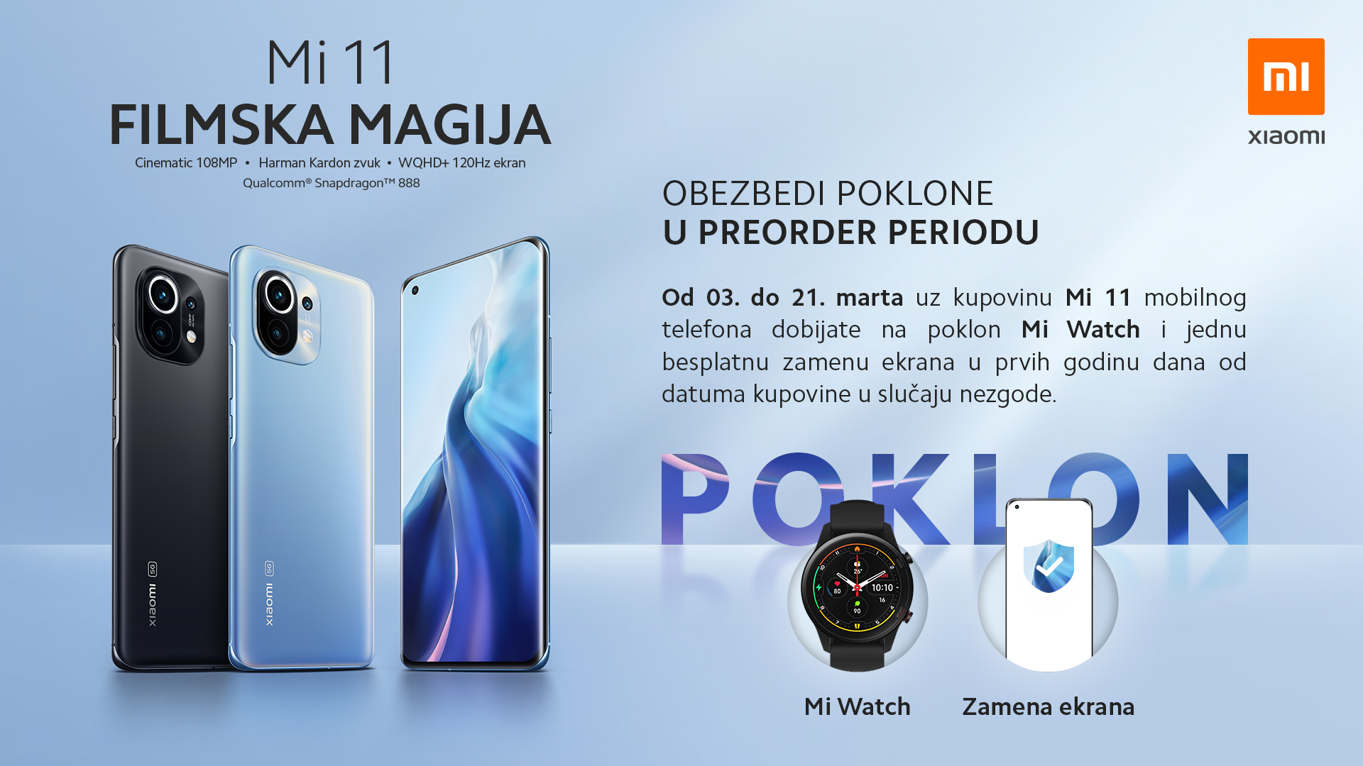 Xiaomi Mi 11 se može prednaručiti u Srbiji od 01. Marta, a svi koji se odluče na preorder dobiće na poklon Mi Watch, pametni sat kao i jednu besplatnu zamenu ekrana u slučaju lomljenja u prvih godinu dana. Više detalja pogledajte na www.mi-srbija.rs.