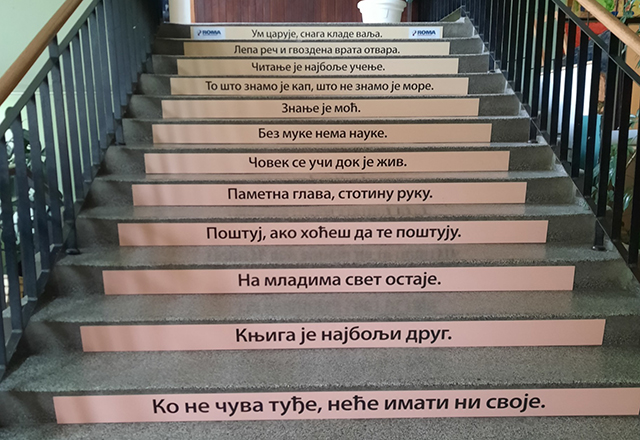 Unutrašnje stepenice, kojima đaci svakodnevno prolaze, pokazale su se kao idealno rešenje za postavljanje ispisa sa pravilnim i nepravilnim izrazima.